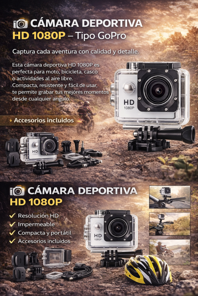 Esta cámara deportiva HD 1080P es perfecta para moto, bicicleta, casco o actividades al aire libre. Compacta, resistente y fácil de usar, te permite grabar tus mejores momentos desde cualquier ángulo.