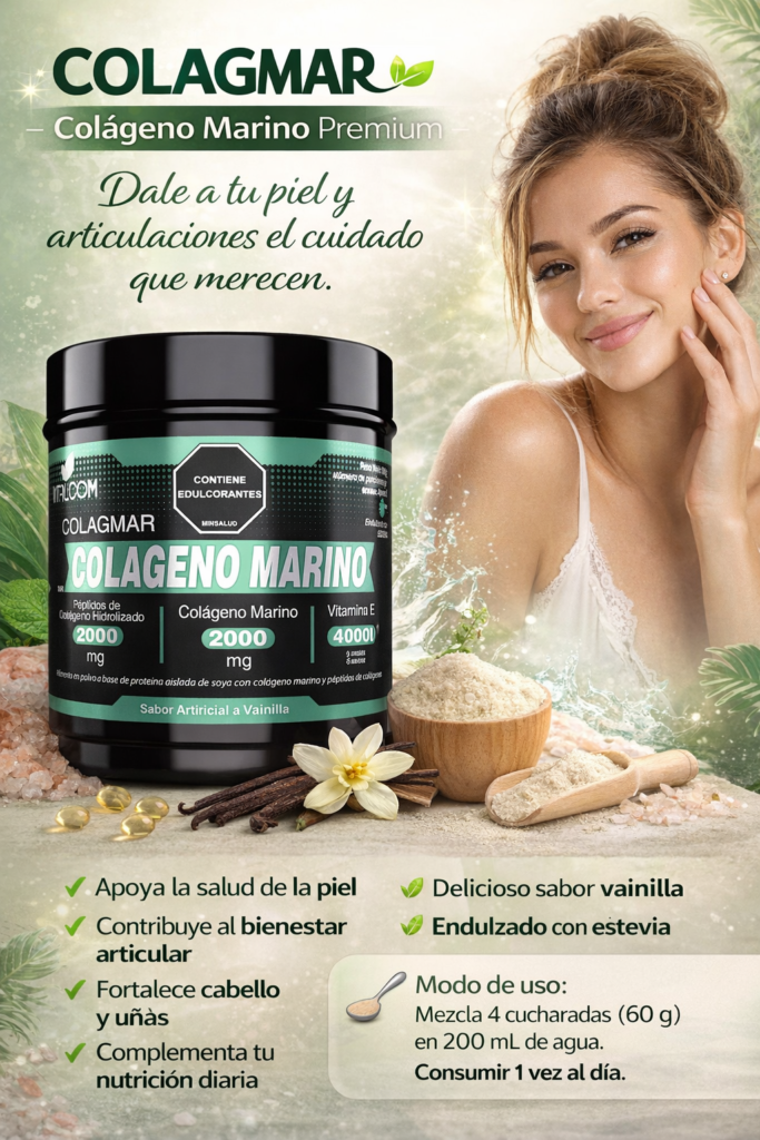 COLAGMAR es un suplemento en polvo con colágeno marino + péptidos de colágeno + proteína aislada de soya, enriquecido con vitamina E, complejo B y minerales para apoyar tu bienestar integral.