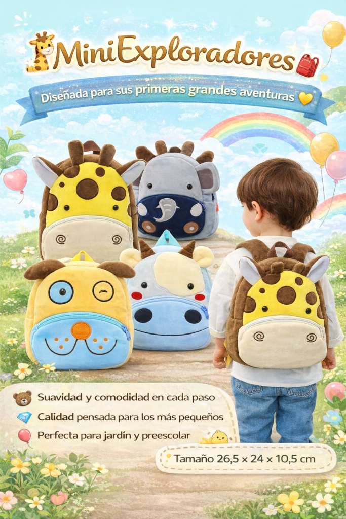 Fabricada en felpa de alta calidad, es ligera, resistente y cómoda para el uso diario. Sus correas ajustables permiten un ajuste perfecto, mientras que su tamaño ideal (26,5 x 24 x 10,5 cm) es perfecto para jardÃn, preescolar o salidas familiares 🎈