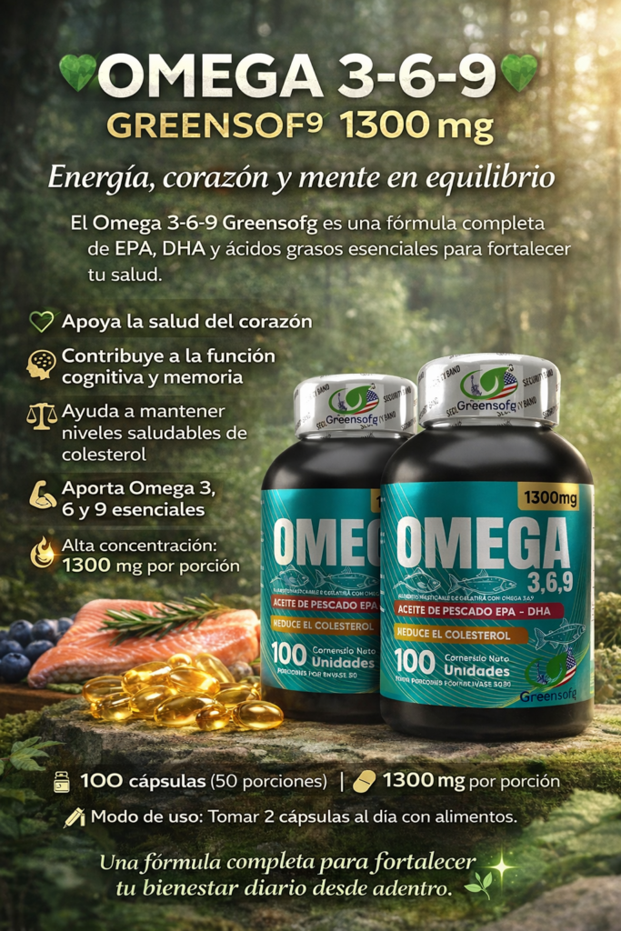 El Omega 3-6-9 Greensofg es un suplemento alimenticio formulado con aceite de pescado rico en EPA y DHA, ácidos grasos esenciales que tu cuerpo necesita para funcionar correctamente.