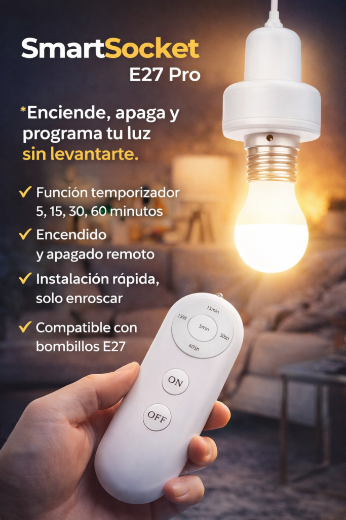 El SmartSocket E27 Pro te permite controlar tu iluminación con control remoto, programar tiempos automáticos y encender o apagar sin necesidad de interruptores.